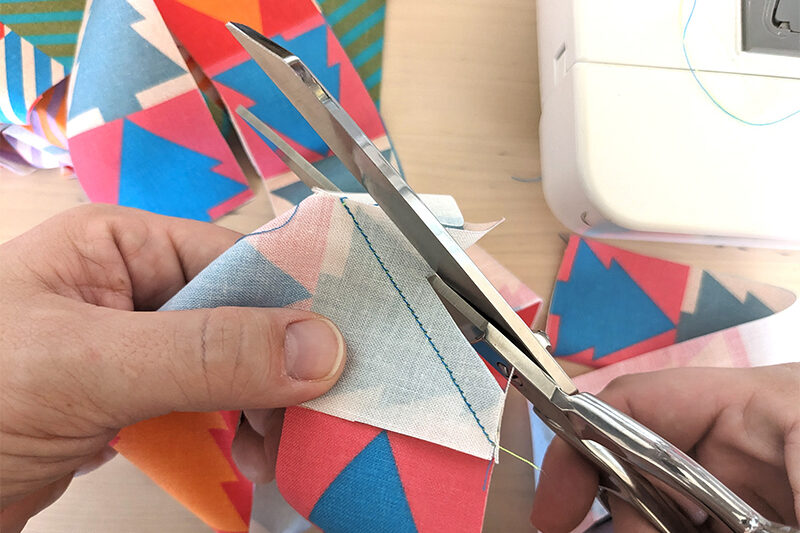 Create a 45-degree angle at the corner by finger pressing the line to seam as shown above. Then sew a straight line from corner to corner on the seam you just finger pressed.