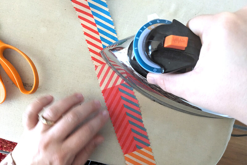 Place the piece of adhesive you just cut out on the top of the ribbon, design side up. Iron down the adhesive for the amount of time it says on your adhesive instructions