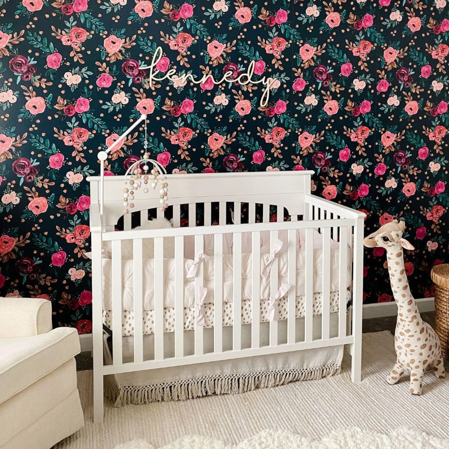 Nursery with bold floral wallpaper panel